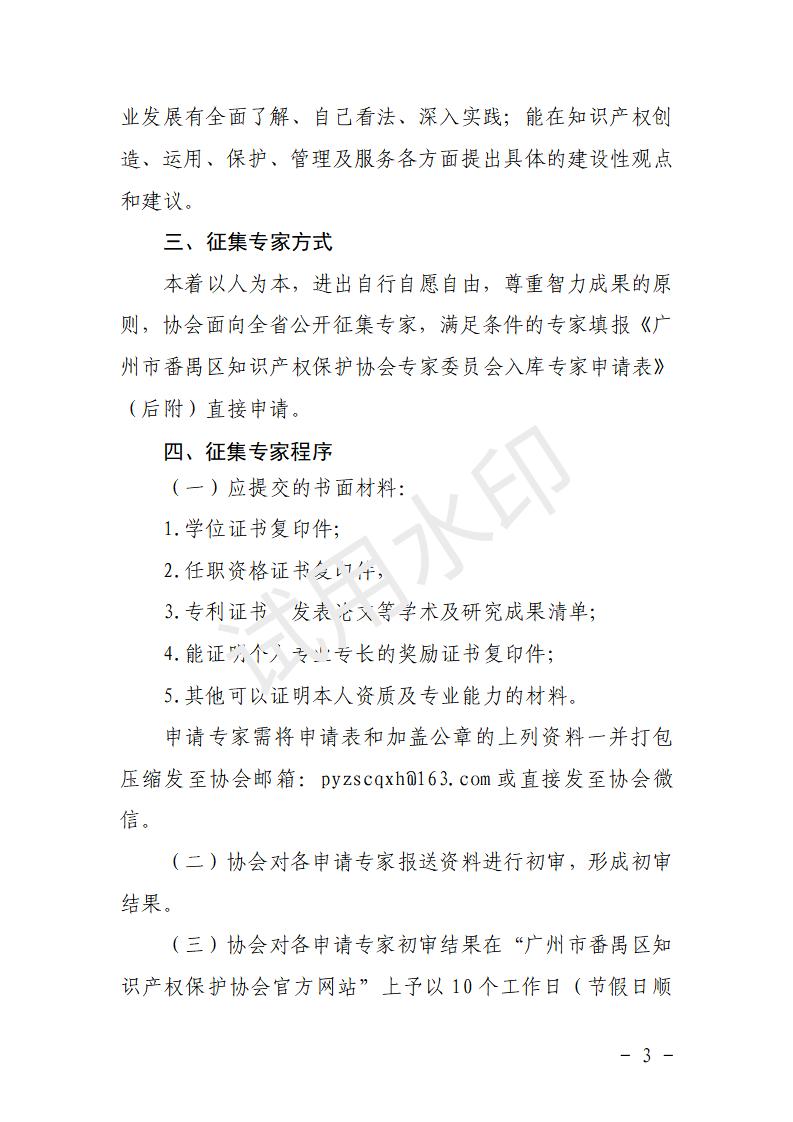 为进一步强化组织人才队伍建设,有力支撑业务开展专业化水平,推动番禺知识产权保护工作上新高度,经反复酝酿研究,协会决定秘书处下设知识产权专家委员会,全省范围内征集专家并建库动态管理。通过申请的专家将作为政府承接服务项目意见建议征集、验收评审,专业咨询、辅导服务以及论坛、研讨、政策宣讲、专题培训各类活动对话嘉宾、演讲(授课)教师等的储备力量。现就有关事项通知如下: